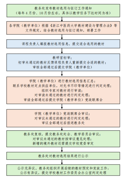(五)其他未尽事宜,按照教育部、省教育厅有关教材管理规定,《普通高等学校教材管理办法》《浙江省普通高等学校教材管理实施细则》《大中小学教材问题办理工作规程(试行)》《浙江中医药大学教材建设与管理办法》《浙江中医药大学“马工程”重点教材选用管理办法》等文件执行。