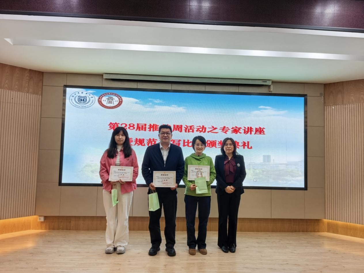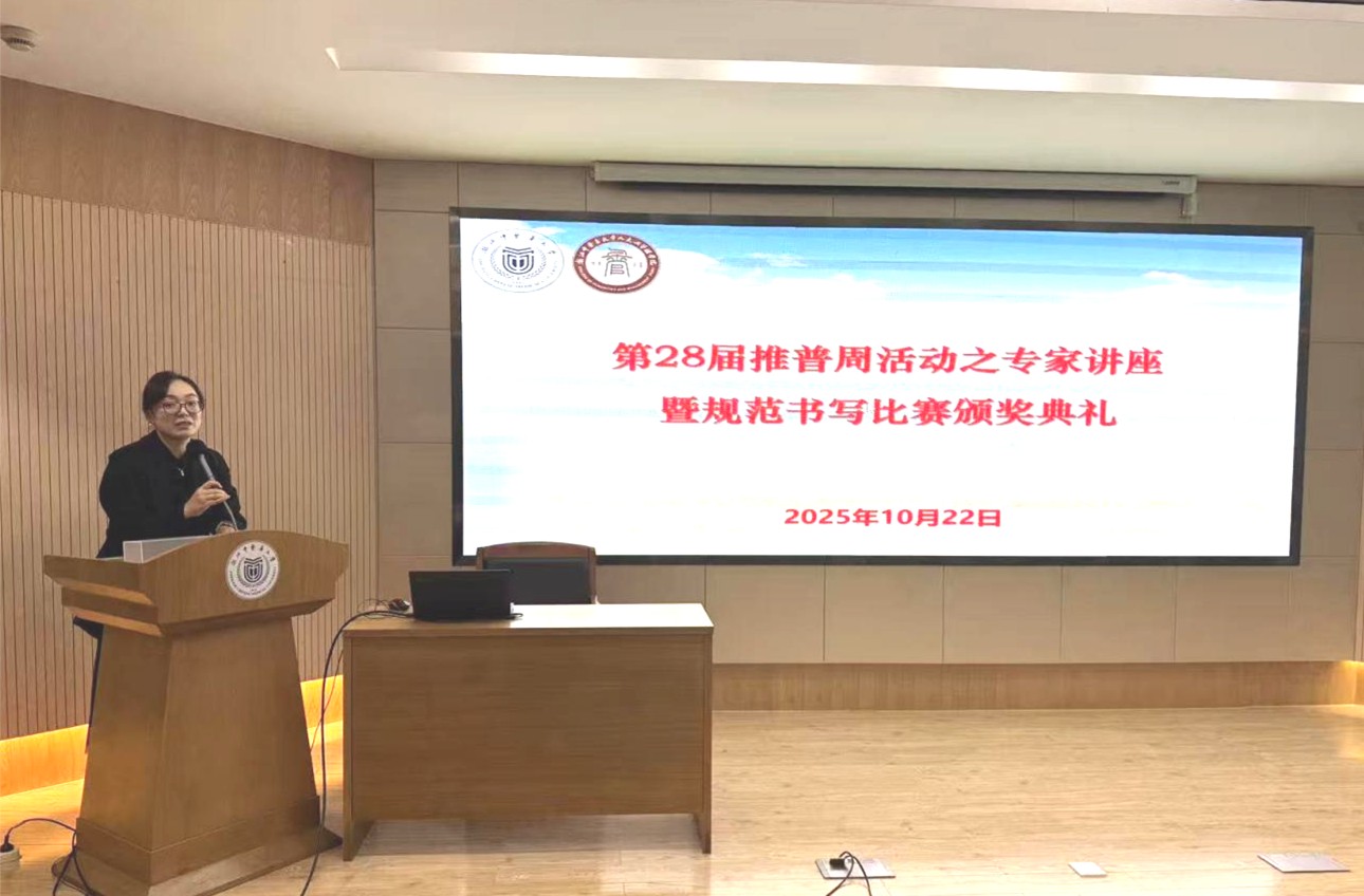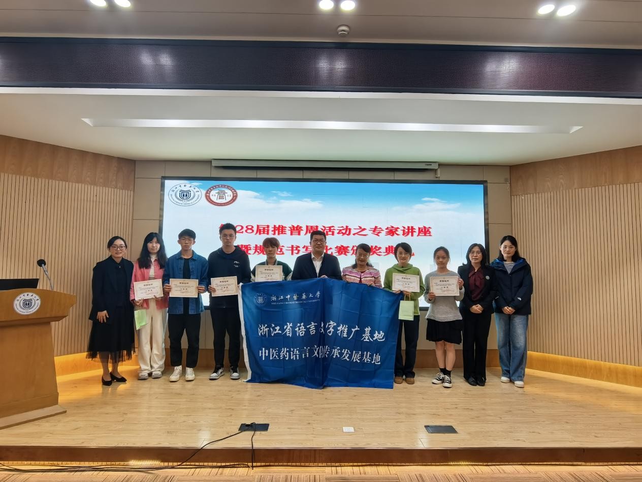 10月22日,我校第28届推广普通话宣传周活动之专家讲座暨“书汤头经典,传岐黄正音”规范书写比赛颁奖典礼在滨文校区23101教室顺利举行。浙江工商大学教授王晓华、浙江中医药大学教务处副处长季旭明、团委副书记钱乃婧以及全校师生代表出席活动,人文与管理学院副院长张红霞担任主持。