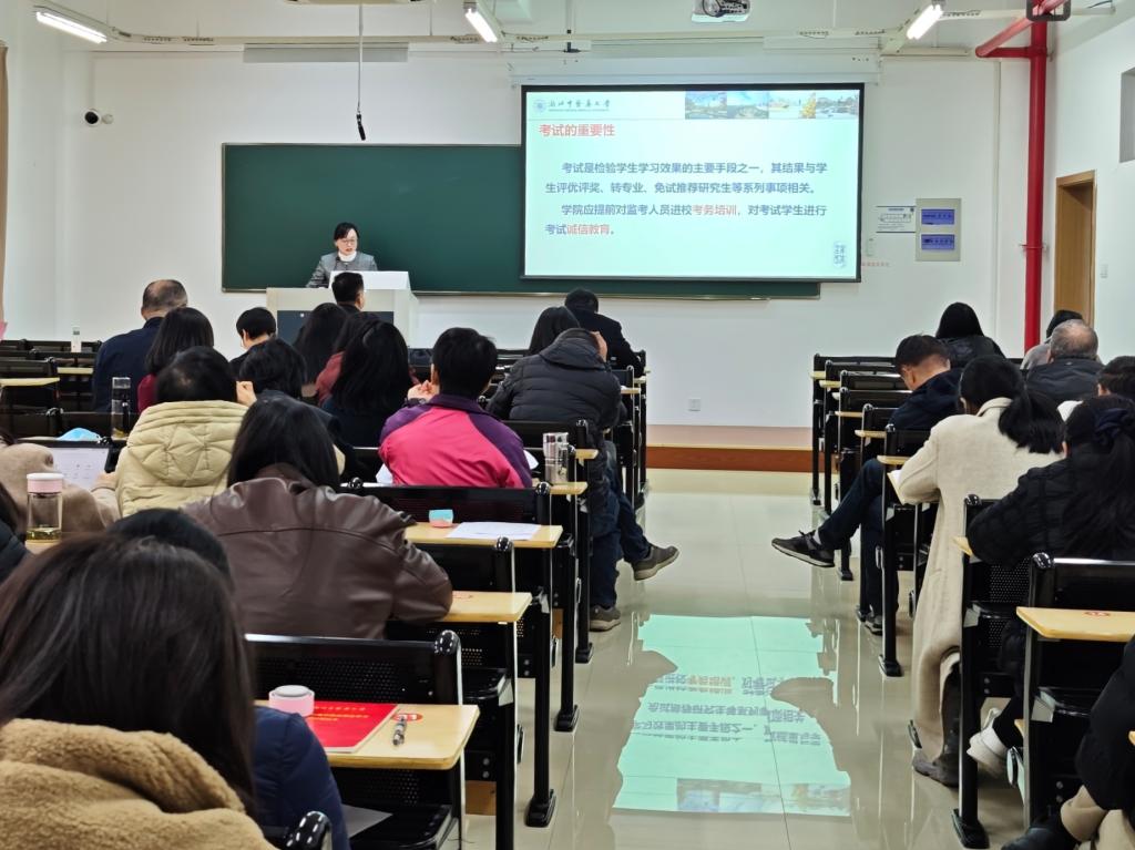 学院副院长张红霞就期末考务工作进行了部署。张院长结合近期学校考务工作通知要求,详细讲解了考试组织流程、监考职责、试卷规范及考风考纪建设等重点内容,要求全体教师高度重视、规范操作,确保期末各项考试工作平稳有序进行。