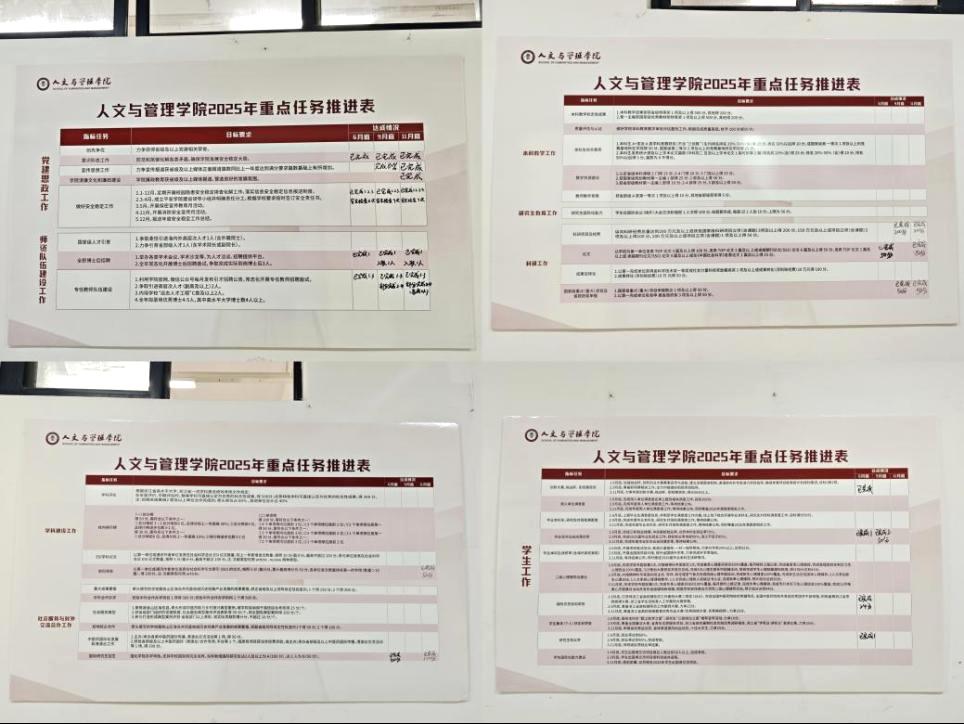 九、营造学院环境育人氛围。 结合学院办学理念与发展特色,对人文楼2A304会议室进行改造,打造荣誉墙,优化育人环境;同时聚焦年度考核目标,编制《学院2025年度重点任务推进表》并安装上墙,以“挂图作战”方式强化过程监督管理。