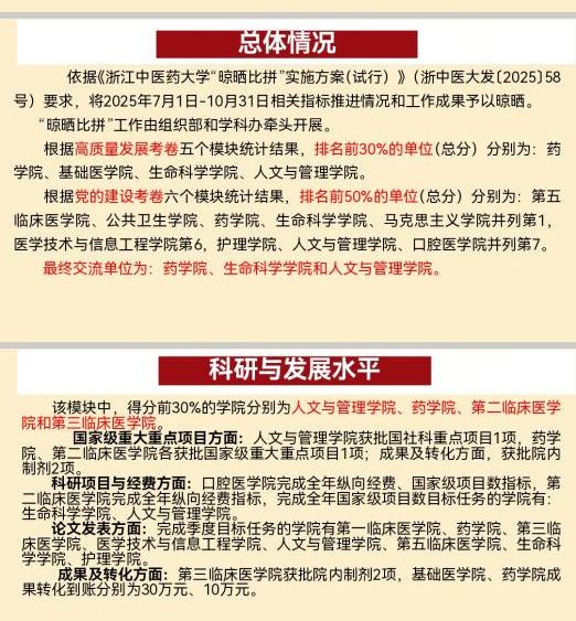 二、“晾晒比拼”得分居全校排名前三。依据学校实施方案,2025年7至10月相关指标得分我院排名前三,其中科研与发展水平模块居全校第一,获交流机会。