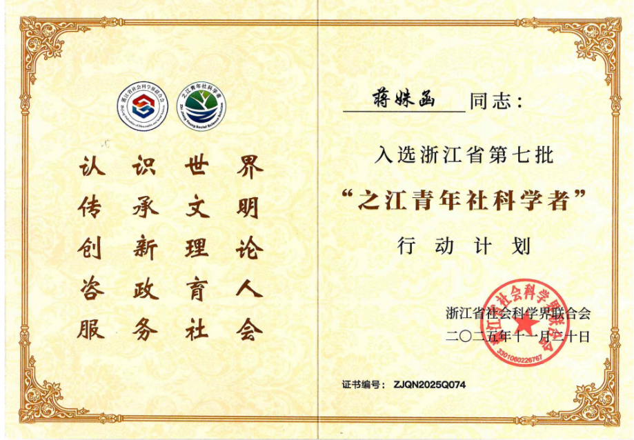 八、学院教师入选浙江省之江青年学者。我院蒋姝函老师成功入选浙江省之江青年学者计划,系全校今年唯一入选者。该荣誉是省社科领域对青年人才的权威认可,标志着学院在青年学术骨干培养与高层次人才队伍建设上实现重要突破。