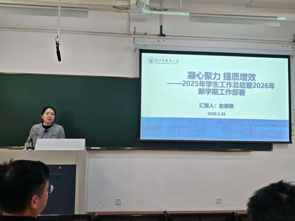 学院纪委书记俞慧娜传达了学校2026年全面从严治党工作会议精神,要求全体教职工进一步提高政治站位,强化责任担当,持续营造风清气正的育人环境。